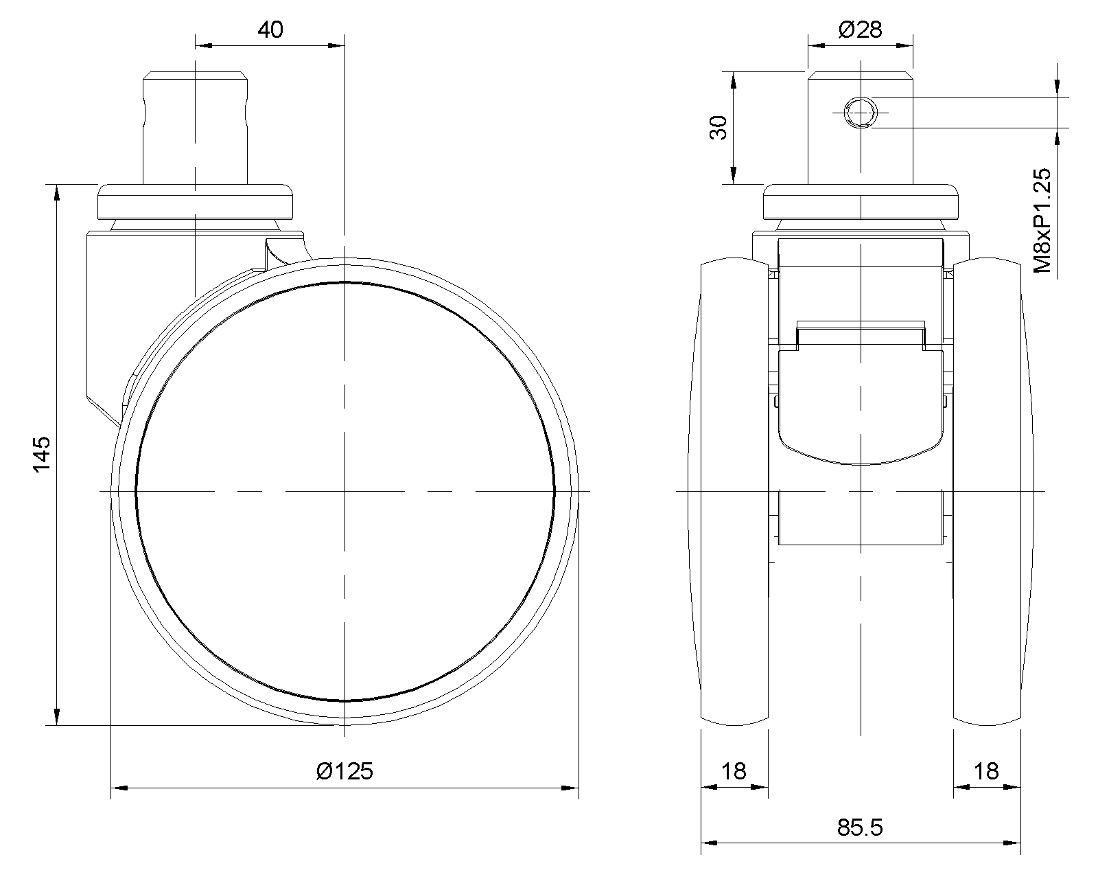 Actuable Casters, mortise-and-tenon Stamping Fork—Ø28x30L Window gray legs made of polyamide reinforced material Rust-proof, Corrosion resistant, Attractive appearance, Economical, and allows for Smooth rotation High-Quality Impact-Resistant Polypropylene Wheel Center, High-Quality Reinforced Polypropylene Rubber (TPR) Wheel Tread Dark gray, Bearing—Ball Bearings |