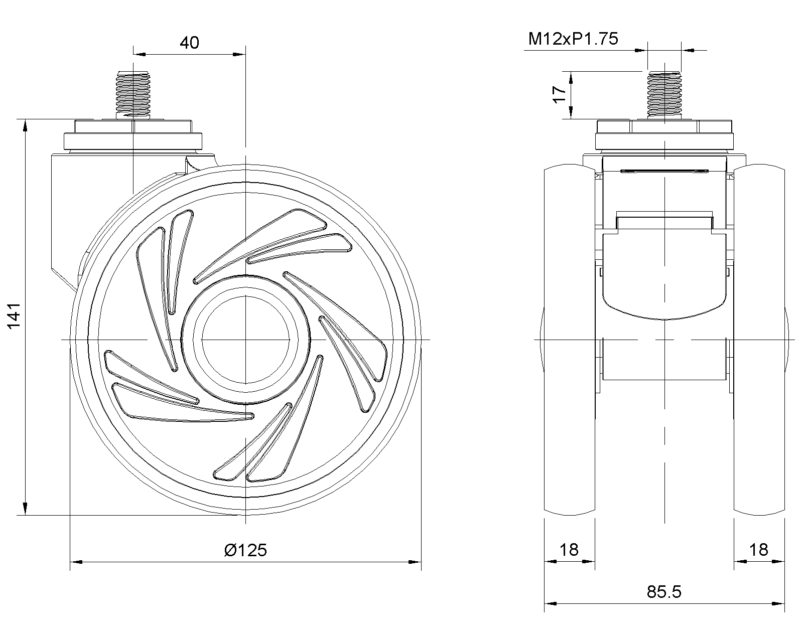Actual Casters, Threaded Stem M12x17 Window gray Casters made of polyamide reinforced material Rust-proof, Corrosion resistant, Attractive appearance, Economical, and rotates smoothly High-Quality Impact-Resistant Polypropylene Wheel Center, High-Quality Reinforced Polypropylene Rubber (TPR) Wheel Tread Dark gray, Bearing—Ball Bearings |
