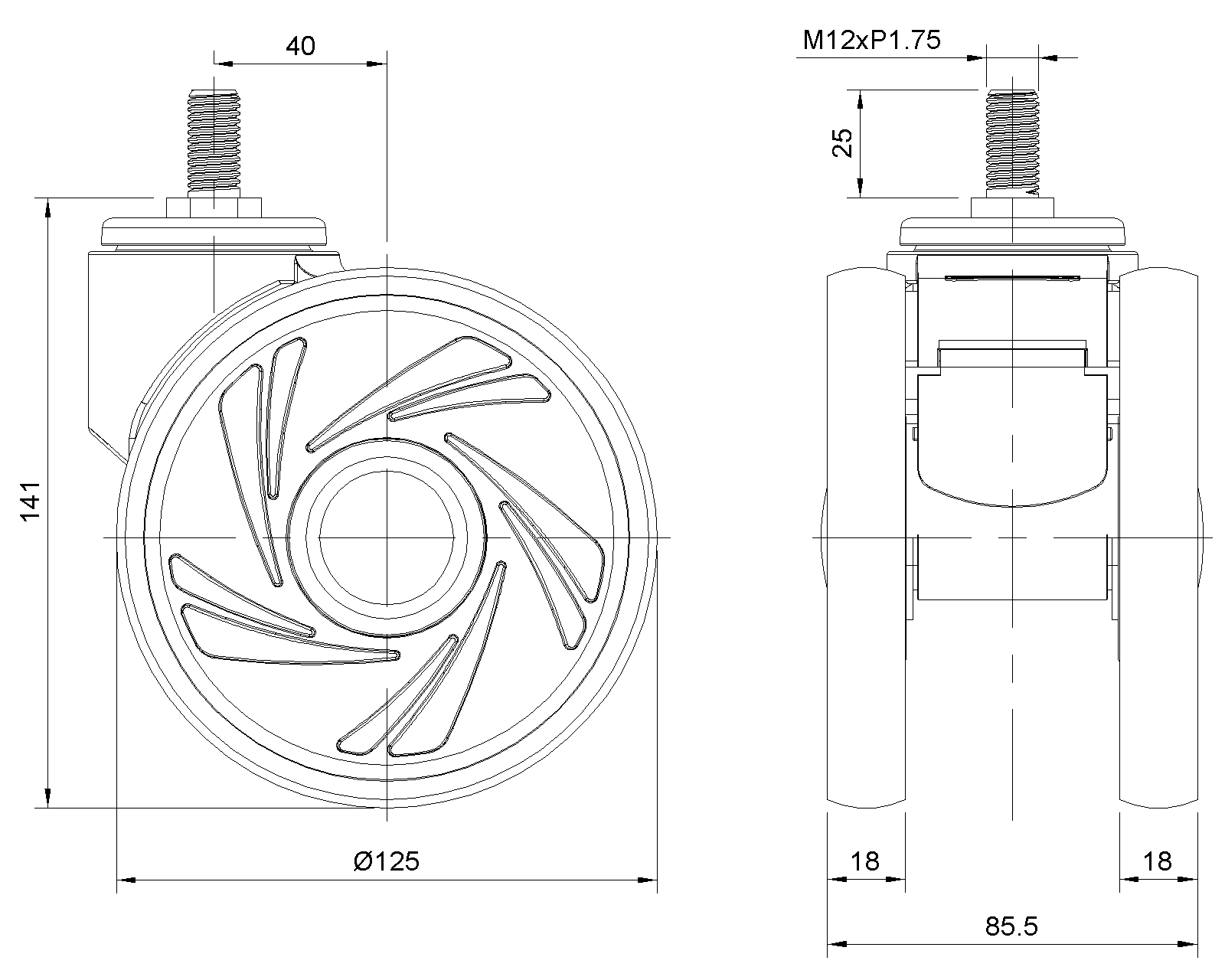 Actual Casters, Threaded Stem M12x25 Window gray Casters made of polyamide reinforced material Rust-proof, Corrosion resistant, Attractive appearance, Economical, and allows for smooth rotation High-Quality Impact-Resistant Polypropylene Wheel Center, High-Quality Reinforced Polypropylene Rubber (TPR) Wheel Tread Dark gray, Bearing—Ball Bearings |