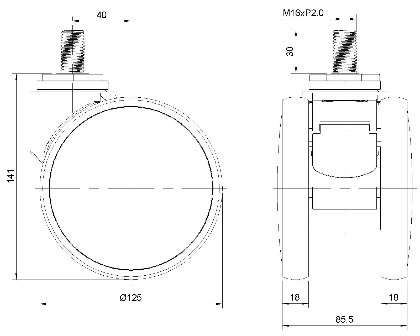 Actuable Casters, Threaded Stem M16x30 Window gray Casters made of polyamide reinforced material Rust-proof, Corrosion resistant, Attractive appearance, Economical, and rotates smoothly High-Quality Impact-Resistant Polypropylene Wheel Center, High-Quality Reinforced Polypropylene Rubber (TPR) Wheel Tread Dark gray, Bearing—Ball Bearings |
