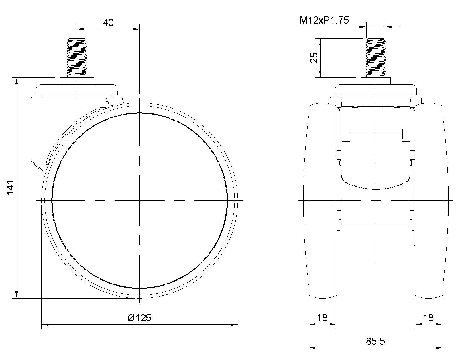 Actual Casters, Threaded Stem M12x25 Window gray Casters made of polyamide reinforced material Rust-proof, Corrosion resistant, Attractive appearance, Economical, and allows for smooth rotation High-Quality Impact-Resistant Polypropylene Wheel Center, High-Quality Reinforced Polypropylene Rubber (TPR) Wheel Tread Dark gray, Bearing—Ball Bearings |