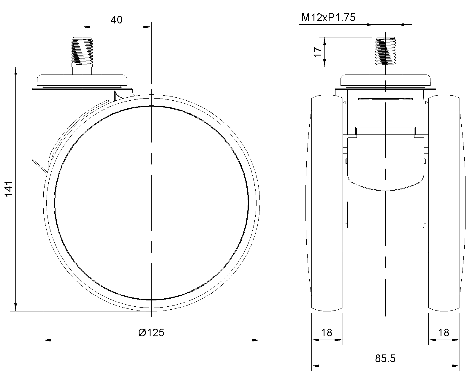 Actual Casters, Threaded Stem M12x17 Window gray Casters made of polyamide reinforced material Rust-proof, Corrosion resistant, Attractive appearance, Economical, and rotates smoothly High-Quality Impact-Resistant Polypropylene Wheel Center, High-Quality Reinforced Polypropylene Rubber (TPR) Wheel Tread Dark gray, Bearing—Ball Bearings |