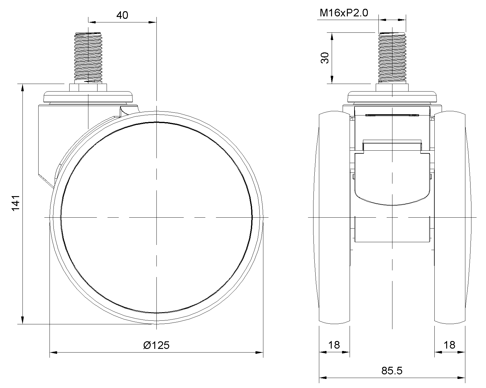 Actuable Casters, Threaded Stem M16x30 Window gray Casters made of polyamide reinforced material Rust-proof, Corrosion resistant, Attractive appearance, Economical, and rotates smoothly High-Quality Impact-Resistant Polypropylene Wheel Center, High-Quality Reinforced Polypropylene Rubber (TPR) Wheel Tread Dark gray, Bearing—Ball Bearings |