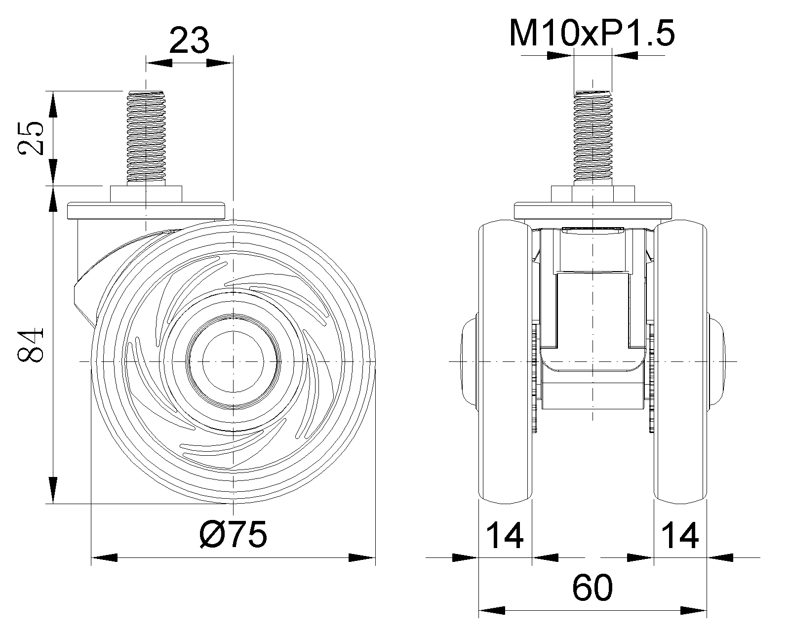 | Wheel tread: Thermoplastic rubber elastomer (TPR) Wheel Center: Made of high-quality impact-resistant polypropylene Drawings are for reference only and may differ from the product |