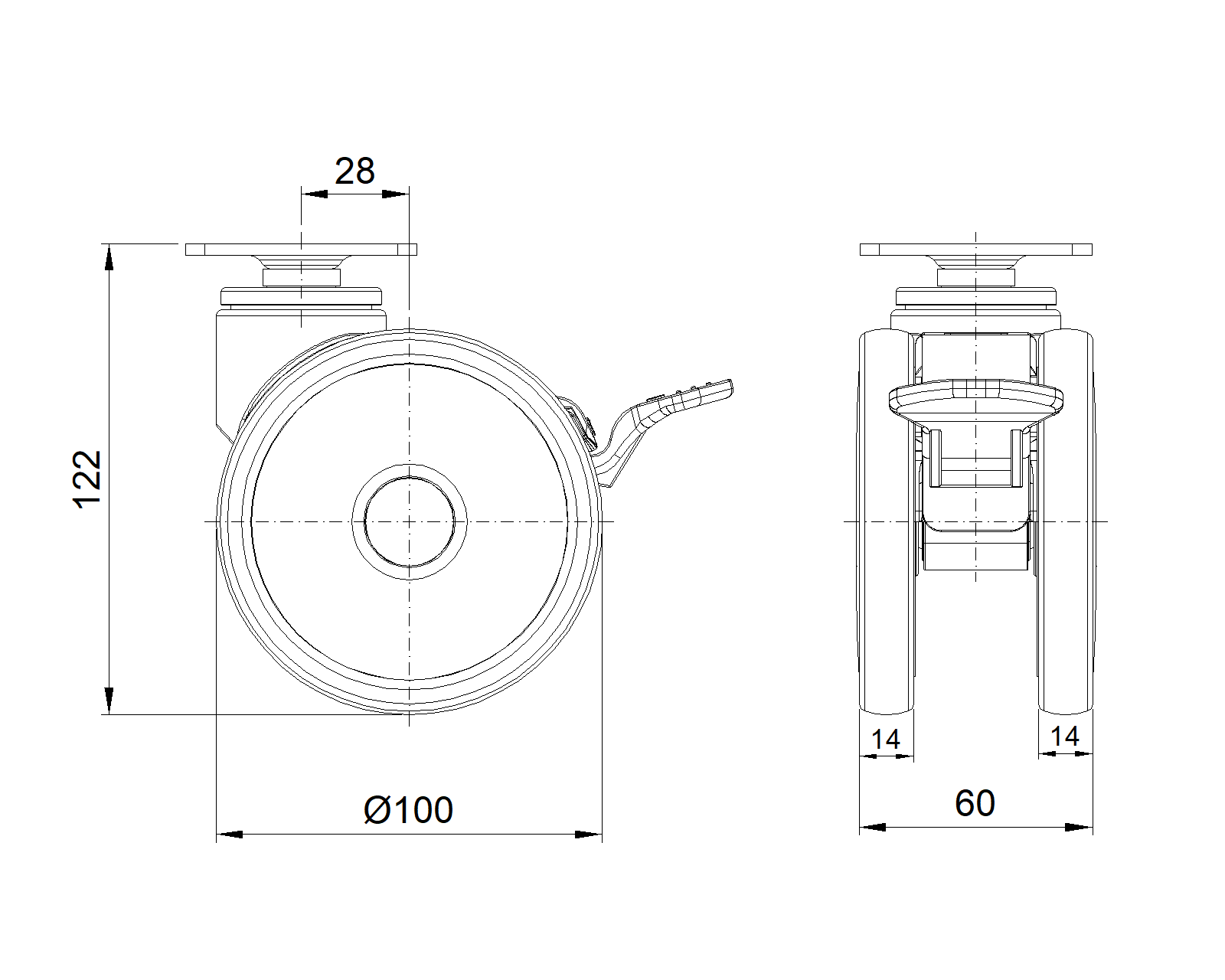| Wheel tread: Thermoplastic rubber elastomer (TPR) Wheel Center: Made of high-quality impact-resistant polypropylene Drawings are for reference only and may differ from the product |