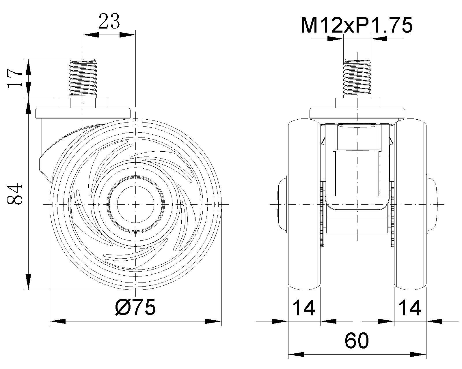 | Resolute Rubber wheel (all black) Wheel Diameter x Wheel Width 75 x 14mm |