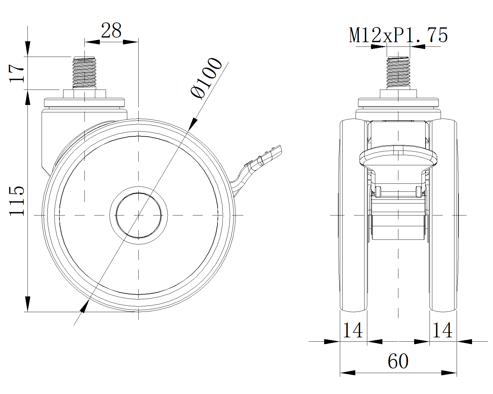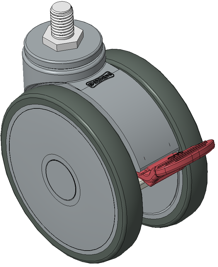 Short Total Brake Casters, Threaded Stem M12x17