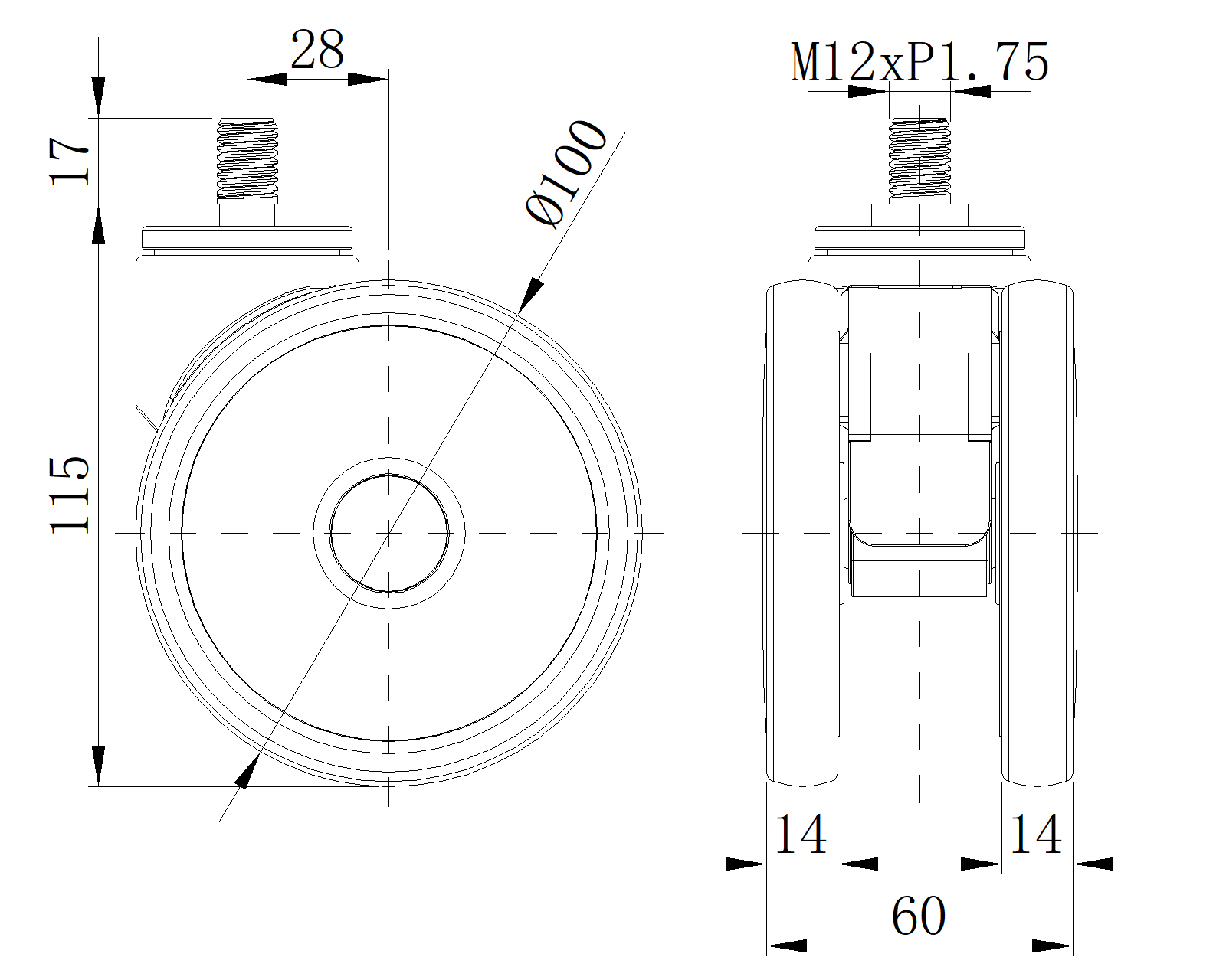 | Wheel tread: Thermoplastic rubber elastomer (TPR) Wheel Center: Made of high-quality impact-resistant polypropylene Drawings are for reference only and may differ from the product |