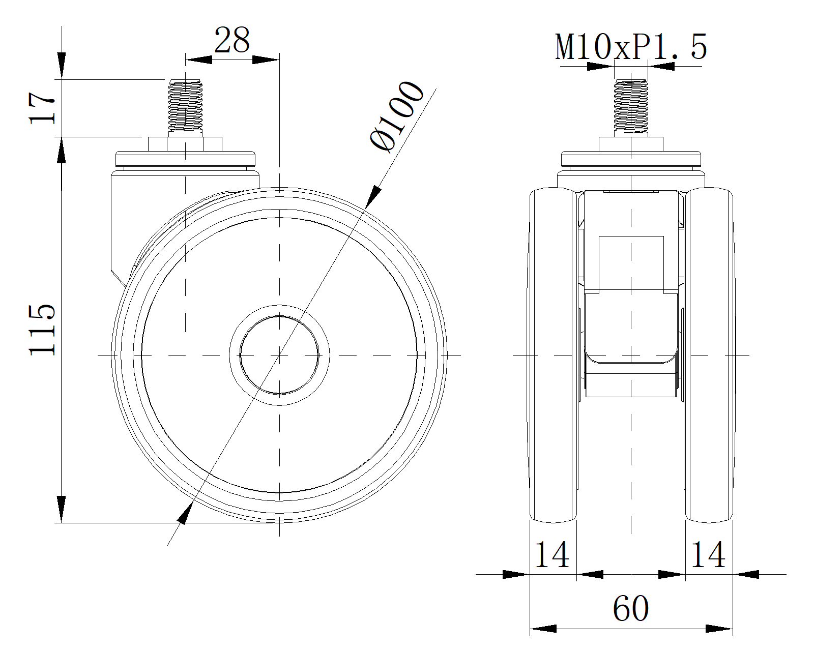 | Wheel tread: Thermoplastic rubber elastomer (TPR) Wheel Center: Made of high-quality impact-resistant polypropylene Drawings are for reference only and may differ from the product |