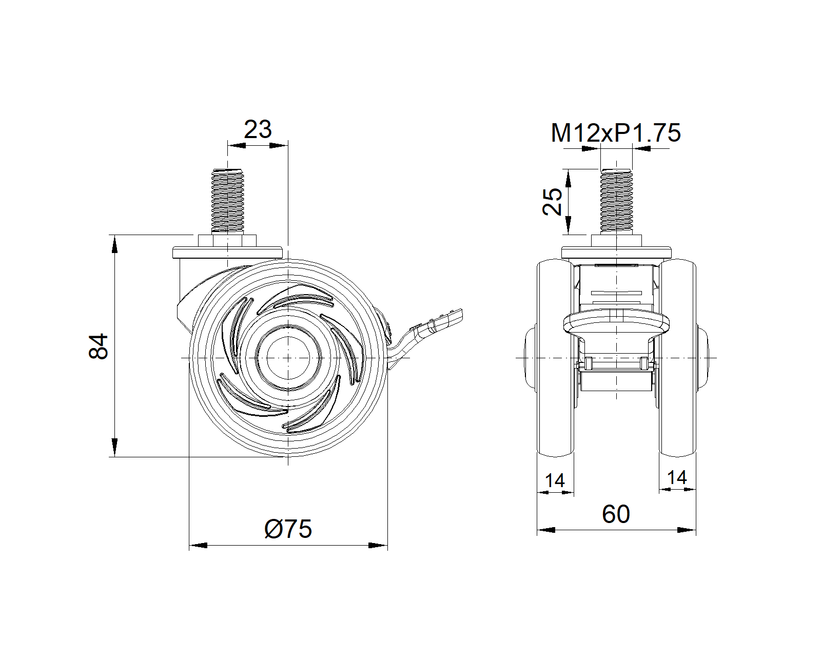 | Resolute Rubber wheel (all black) Wheel Diameter x Wheel Width 75 x 14mm |