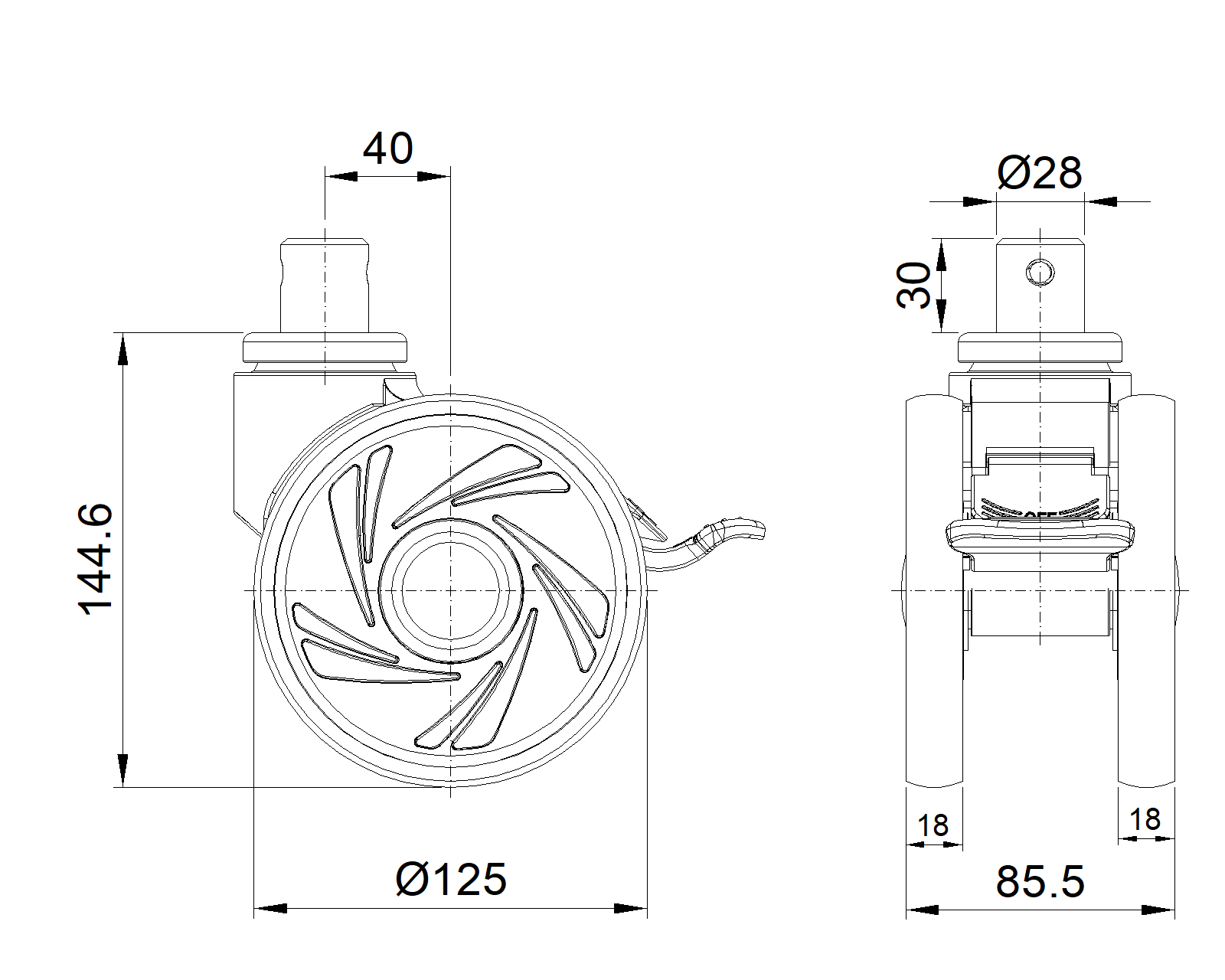 | Bánh xe dài phanh đôi, chân đế dập đinh tán vòng đệm—Ø28x30L