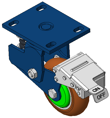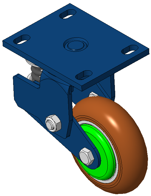 | Rigid Spring-loaded Caster with Welded Caster Fork Blue painted finish, Mounting Type - Top Plate, 110x75 Bolt Hole Spacing Cast Iron core with High Quality Polyurethane Wheel Tread Cast Iron brown, Bearing – Ball Bearings |