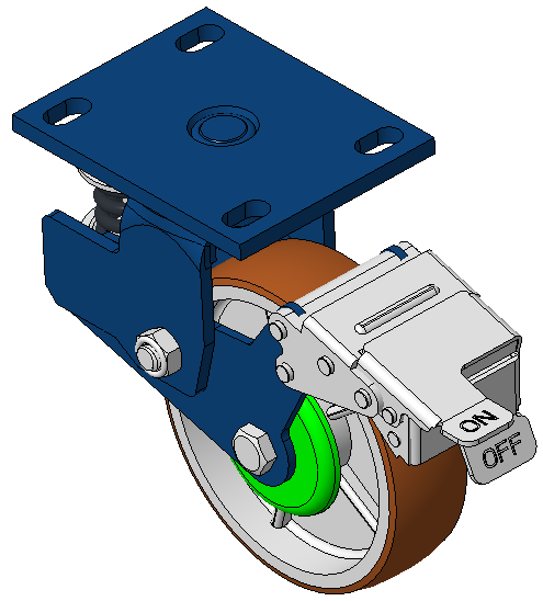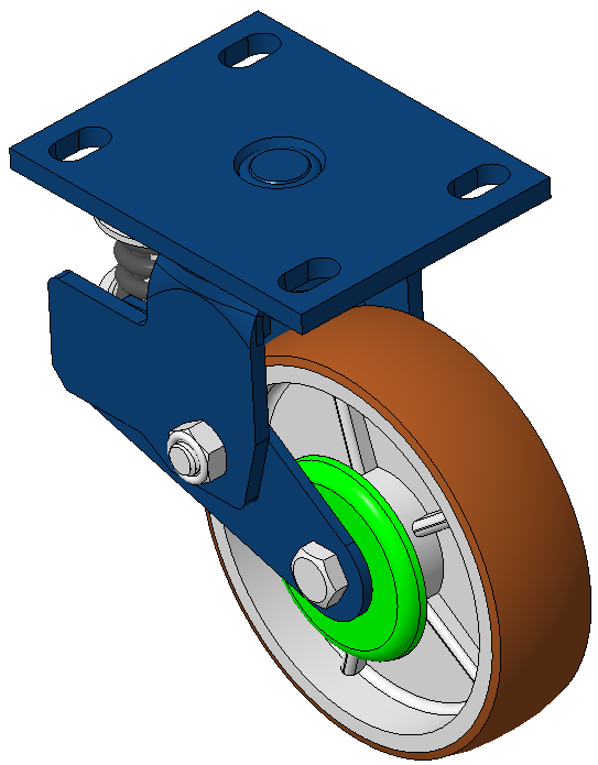 | Rigid Spring-loaded Caster with Welded Caster Fork Blue painted finish, Mounting Type - Top Plate, 110x75 Bolt Hole Spacing Cast Iron core with High Quality Polyurethane Wheel Tread Cast Iron brown, Bearing – Ball Bearings |