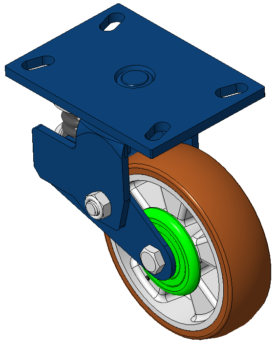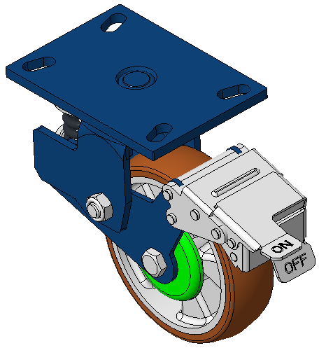 | Rigid Spring-loaded Caster with Welded Caster Fork Blue painted finish, Mounting Type - Top Plate, 129 x 74 Bolt Hole Spacing Cast Iron core with High Quality Polyurethane Wheel Tread Cast Iron brown, Bearing – Ball Bearings |