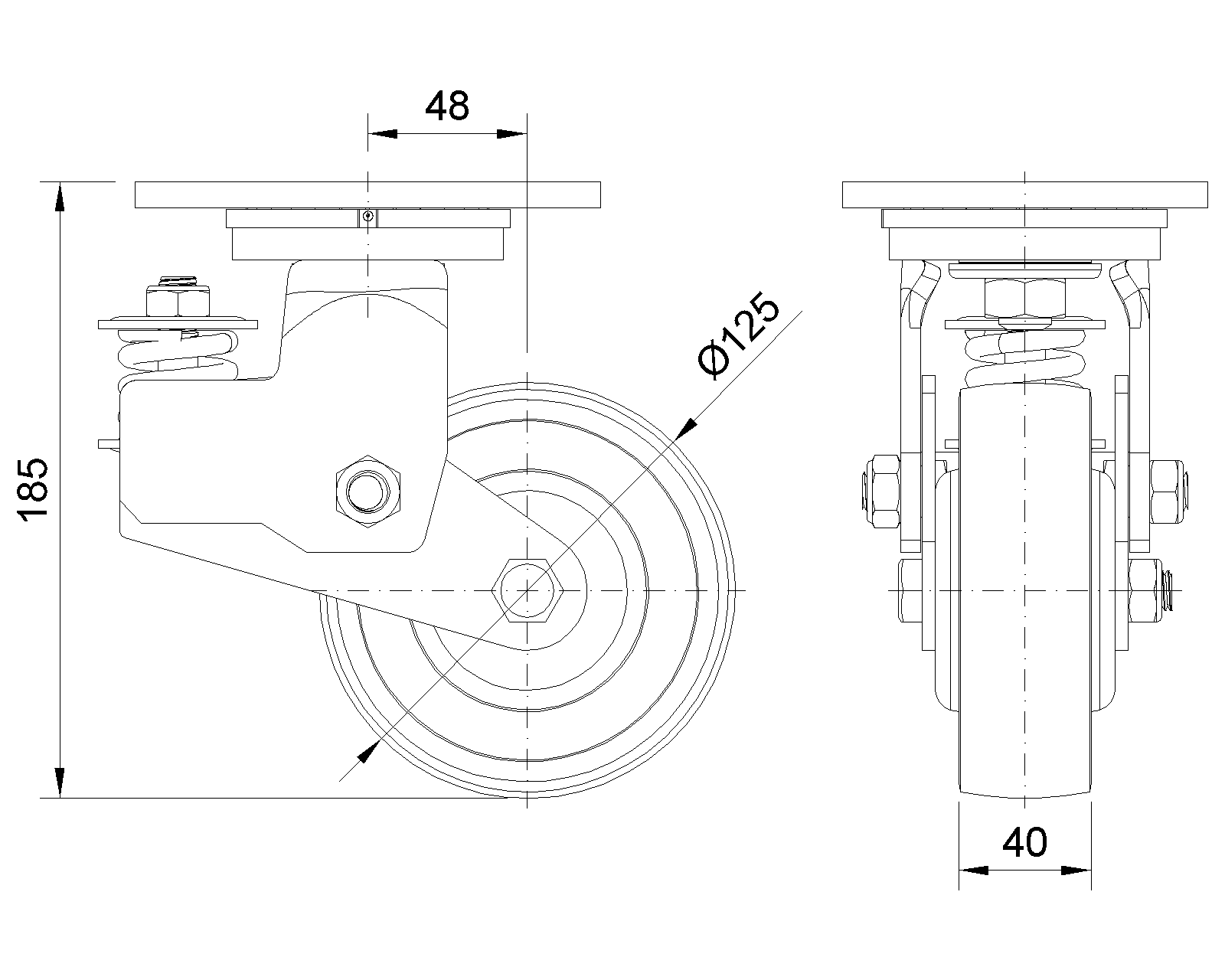 Swivel Spring-loaded Caster with Welded Caster Fork Blue painted finish, Mounting Type - Top Plate, 110x75 Bolt Hole Spacing Cast Iron core with High Quality Polyurethane Wheel Tread Cast Iron red, Bearing—Ball Bearings |