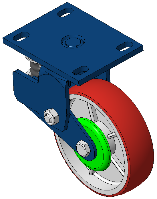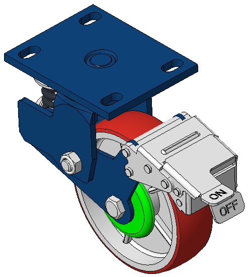 | Spring-loaded Caster with front brake, Welded Caster Fork Blue-painted finish, Mounting Type - Top Plate, 110x75 Bolt Hole Spacing Cast Iron core, High Quality Polyurethane Wheel Tread Red Cast Iron finish, Bearing—Ball Bearings |