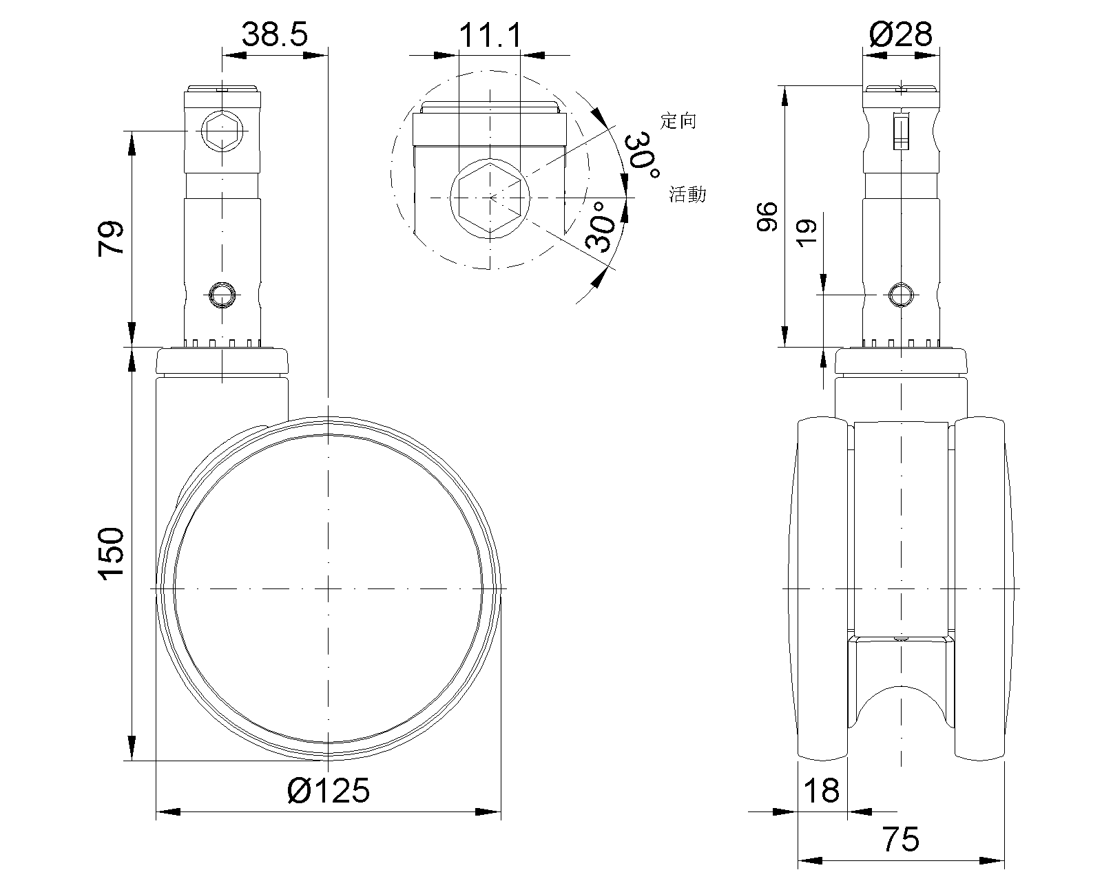Wheel tread: Thermoplastic rubber elastomer (TPR) Wheel Center: Made of high-quality impact-resistant polypropylene Drawings are for reference only and may differ from the product |