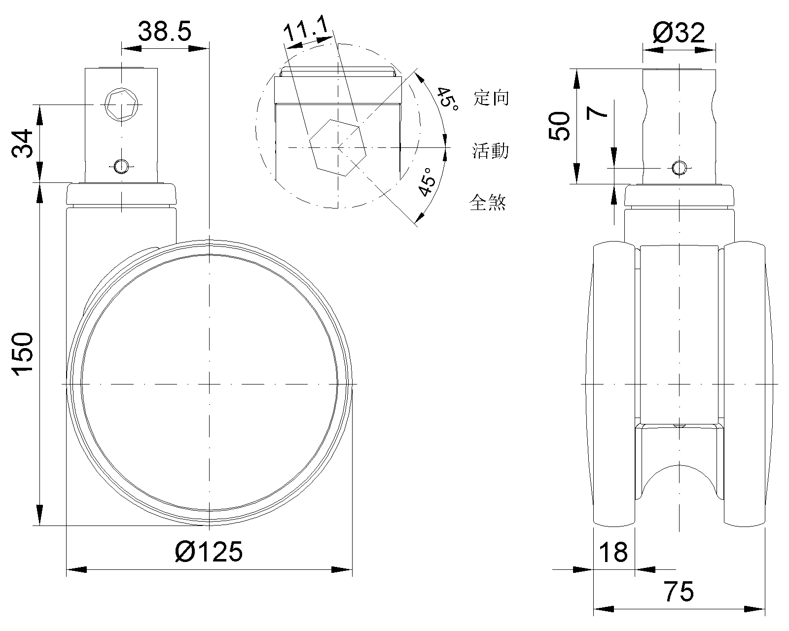 Short lever, Hexagonal hole cam control, center-locked full or directional brake. Casings White Casters, simple and Attractive appearance, Smooth rotation. High-Quality Impact-Resistant Polypropylene Wheel Center, High-Quality Reinforced Polypropylene Rubber (TPR) Wheel Tread. Dark gray, Bearing—Ball Bearings. |