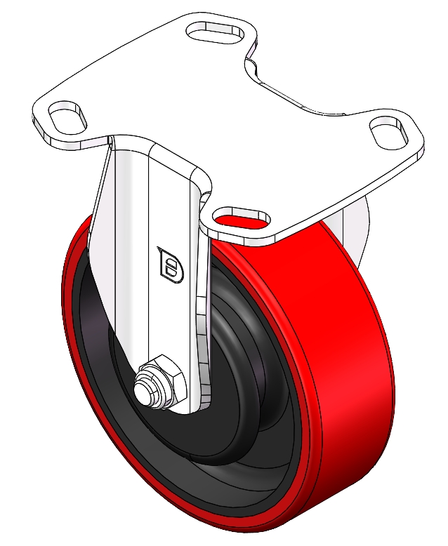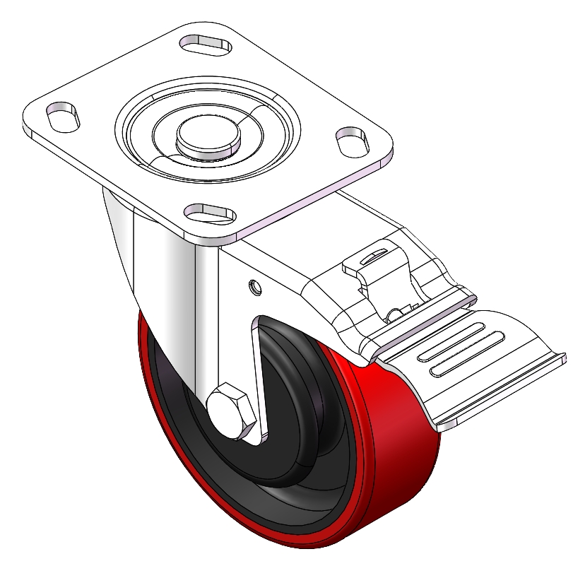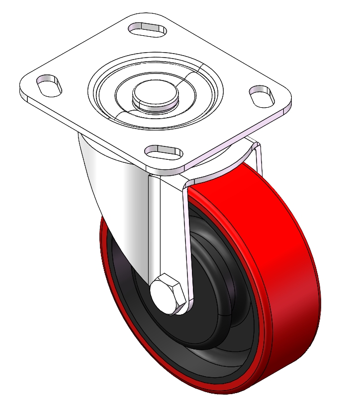 | Swivel Caster with Riveted Fork and Stamping Fork with D-shaped hole. Zine-Plated, Fork-mounted Mounting Type. Cast Iron Wheel Center with High Quality Polyurethane tread. Red Cast Iron finish, Bearing with Ball Bearing. |