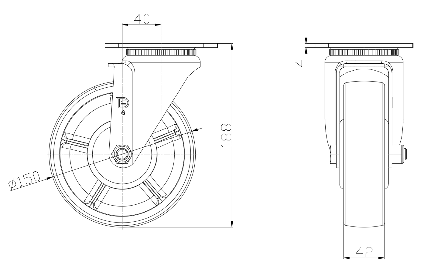 | Wheel tread: Made of high-quality polyurethane Wheel Center: cast iron core Drawings are for reference only and may differ from the product |