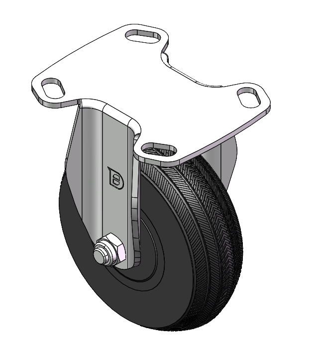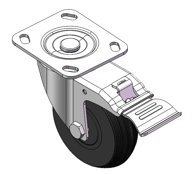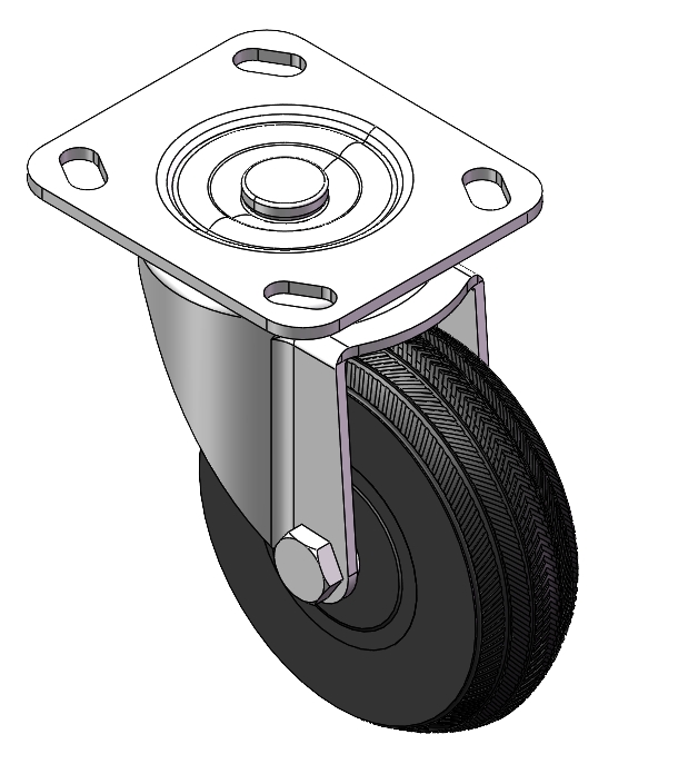| Swivel Caster with Riveted Fork and Stamping Fork—D-shaped hole. Zine-Plated, Fork-mounted (4T) Mounting Type system. Cast Iron Wheel Center with High-Quality Resilient Rubber tread. Black, Bearing—Ball Bearing. |