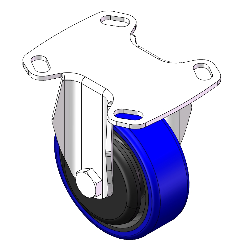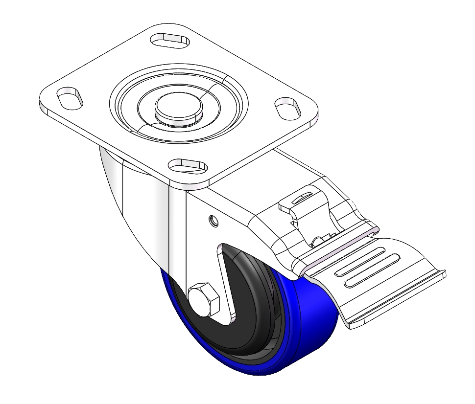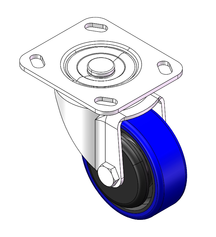 | Swivel Caster with Riveted Fork and Stamping Fork – 85 x 70mm (3-3/8" x 2-3/4") Bolt Hole Spacing Zine-Plated, Fork-mounted (4T) Mounting Type system Cast Iron Wheel Center, High Quality Polyurethane tread Blue color, Bearing – Ball Bearing. |