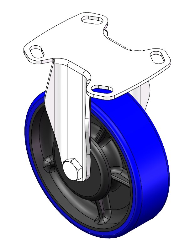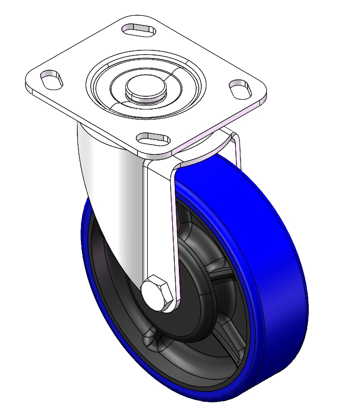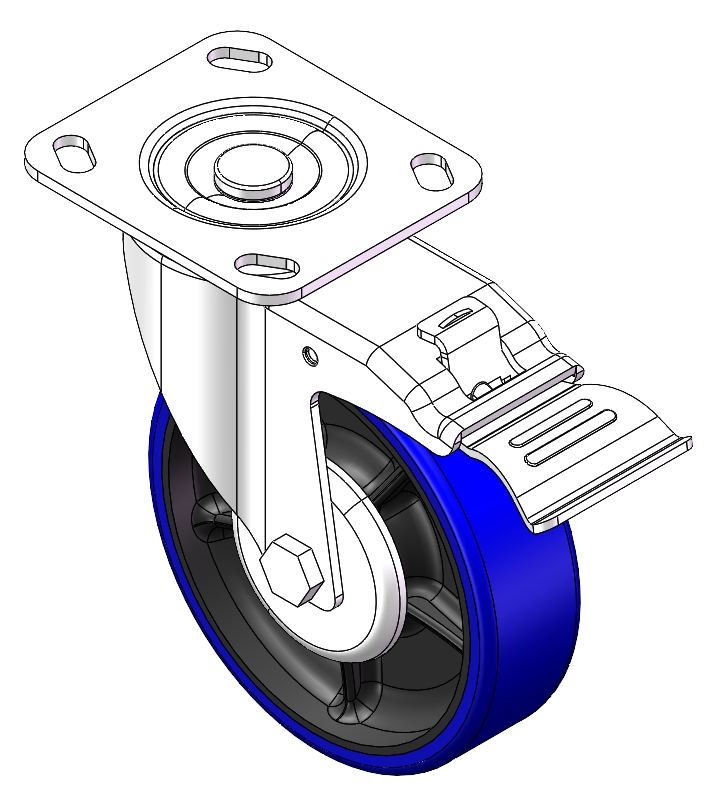 | Casters with Total Brakes and Locking system. Top Plate Riveted and Stamping 85 x 70mm (3-3/8" x 2-3/4") Bolt Hole Spacing. Zine-Plated, Top Plate (4T) Mounting Type. Cast Iron Wheel Center with High Quality Polyurethane tread. Blue color. Bearing: Ball Bearing. |