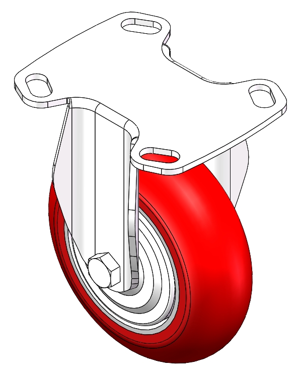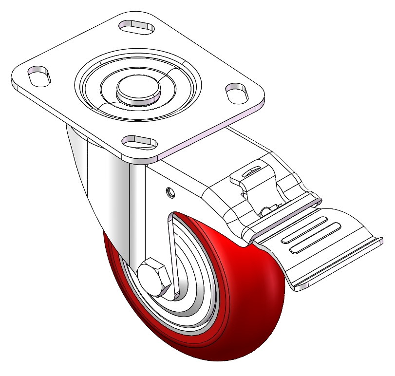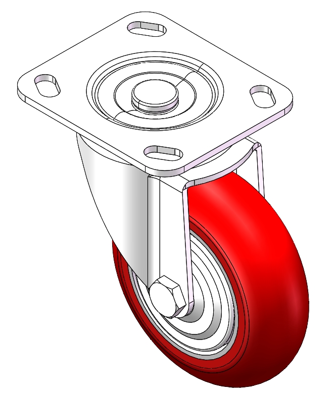 | Swivel Caster with Riveted Fork and Stamping Fork with D-shaped hole. Zine-Plated, Fork-mounted (4T) Mounting Type system. Cast Iron Wheel Center with High Quality Polyurethane tread. Red Cast Iron finish, Bearing with Ball Bearing. |