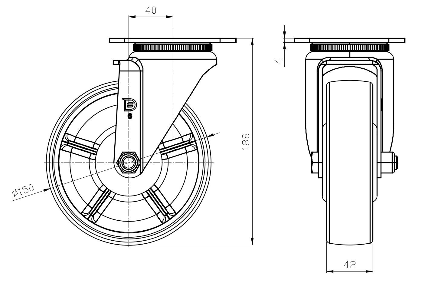 | PU Bánh xe (Vòng cung đỏ) đường kính bánh xe × chiều rộng bánh xe 150 x 42mm |