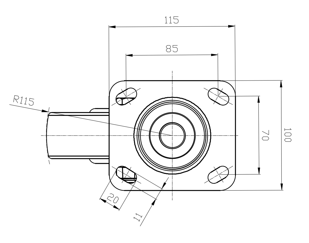 | Bánh xe xoay có đế đinh tán và đế dập có lỗ hình chữ D.