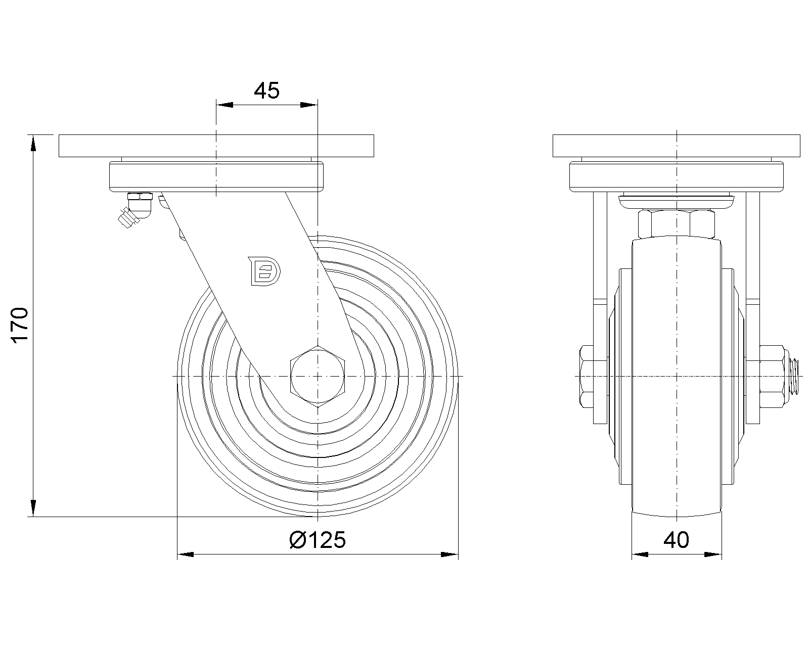 表面喷蓝漆,底板式安装装置,孔距110x75 铸铁制轮芯,高品质聚氨酯轮面,铣褐色 轮子轴承—精密滚珠 |