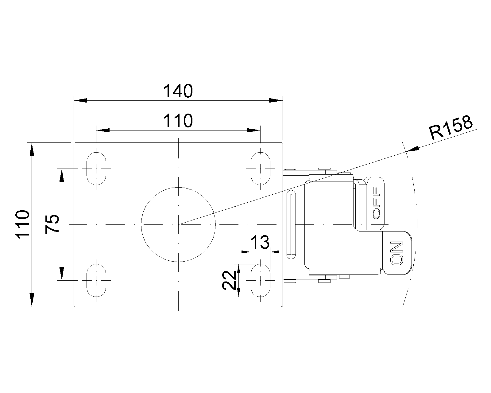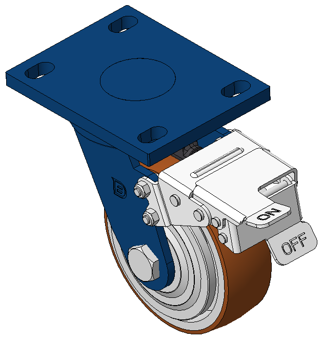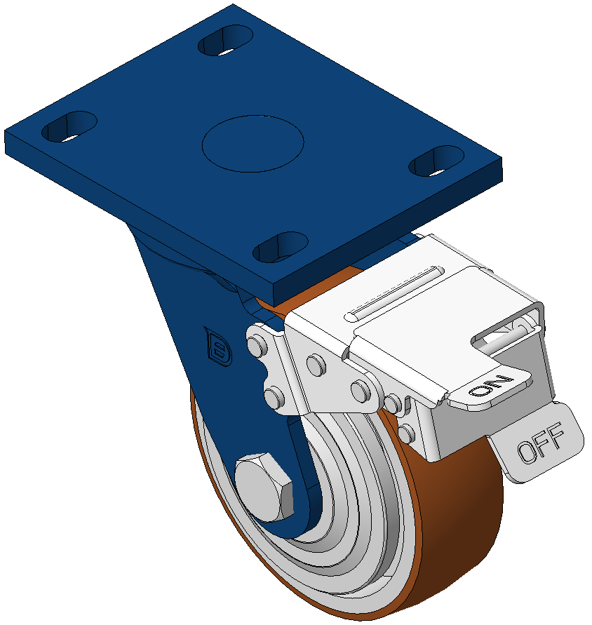 | Front brake Caster with Self-Aligned Locking system, Welded Caster Fork Blue painted finish, Mounting Type - Top Plate, 110x75 Bolt Hole Spacing Cast Iron Wheel Center, High Quality Polyurethane tread, Cast Iron brown Bearing—Ball Bearing |