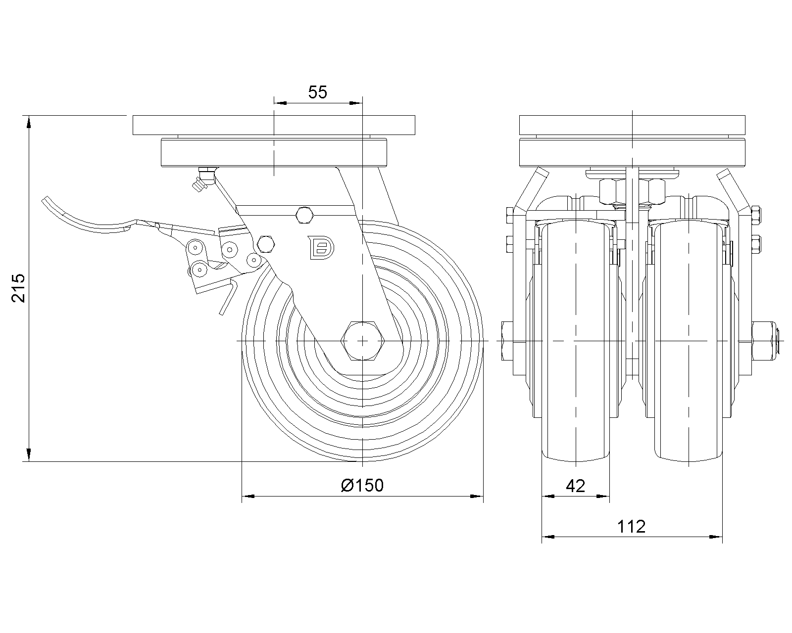 | Casters with rear brake and locking mechanism, Welded Caster Fork, blue painted finish Mounting Type - Top Plate, 140x105 Bolt Hole Spacing Cast Iron Wheel Center, High Quality Polyurethane tread, Cast Iron brown Bearing—Ball Bearing |