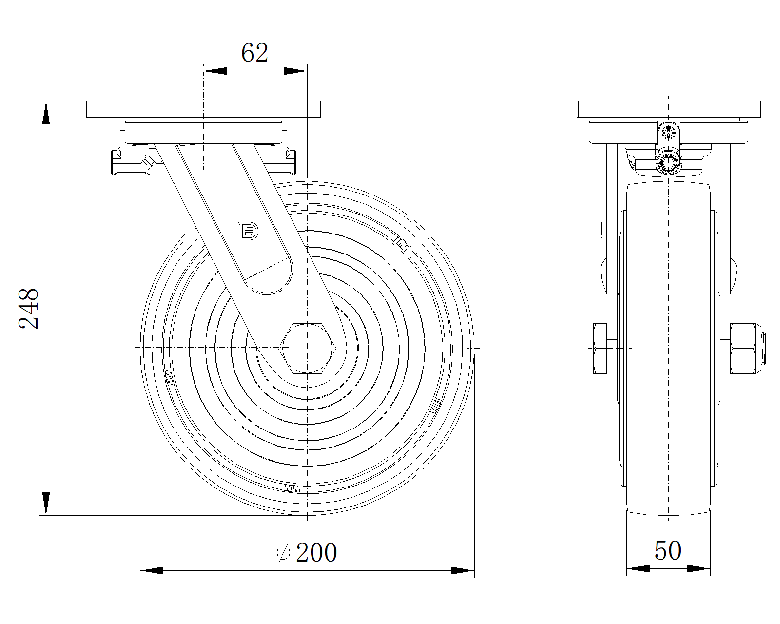 | Bánh xe PU (vòng cung đỏ) Đường kính bánh xe × Chiều rộng bánh xe 200 x 50mm |