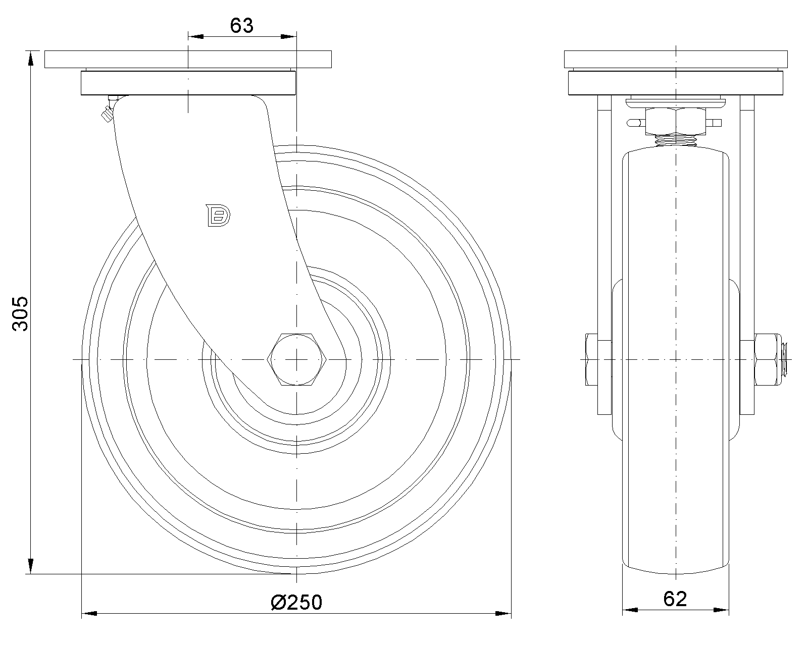 Lắp đế, khoảng cách lỗ 140x85. Lõi gang, mặt lốp polyurethane chất lượng cao, phay màu nâu. Vòng bi bánh xe—vòng bi cầu chính xác. |