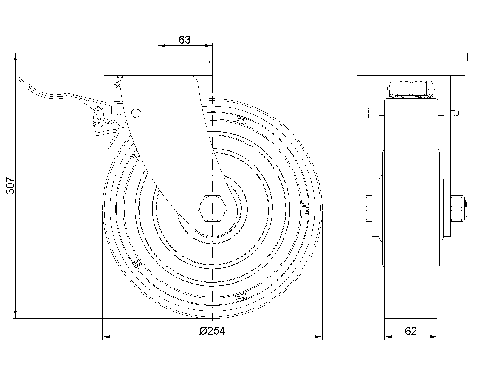 Lắp đế, khoảng cách lỗ 140x85 Lõi bánh xe bằng gang, gai polyurethane chất lượng cao, phay màu đỏ Vòng bi bánh xe—vòng bi cầu chính xác |