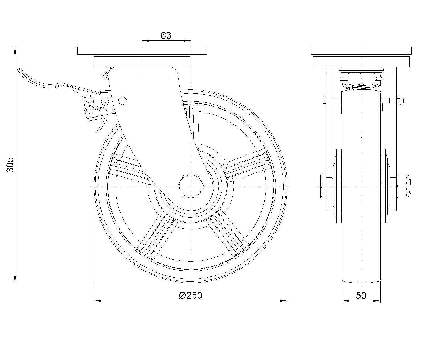 Lắp đế, khoảng cách lỗ 140x85 Lõi bánh xe bằng nhựa nhiệt dẻo, gai bánh xe tự nhiên Vòng bi bánh xe—vòng bi cầu chính xác |