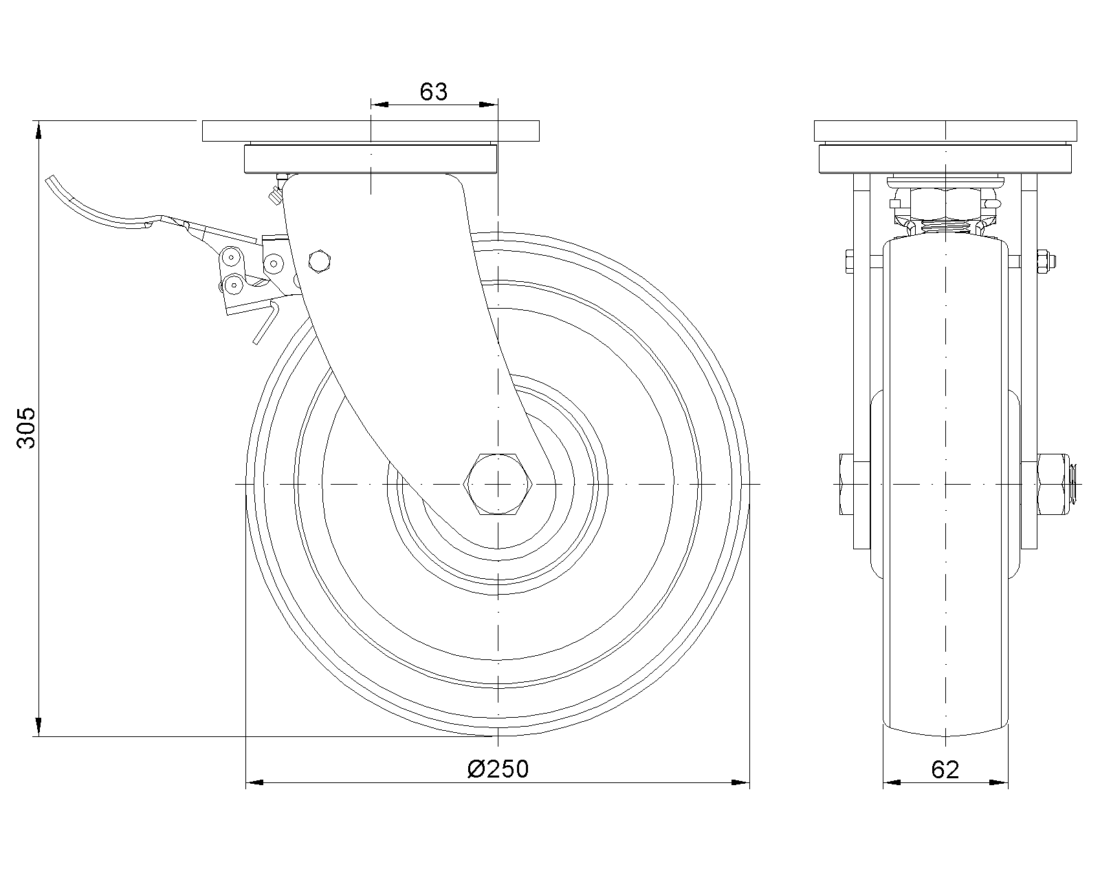 | Bánh xe VXPU (vòng cung đỏ rượu) Đường kính bánh xe × Chiều rộng bánh xe 250 x 62mm |