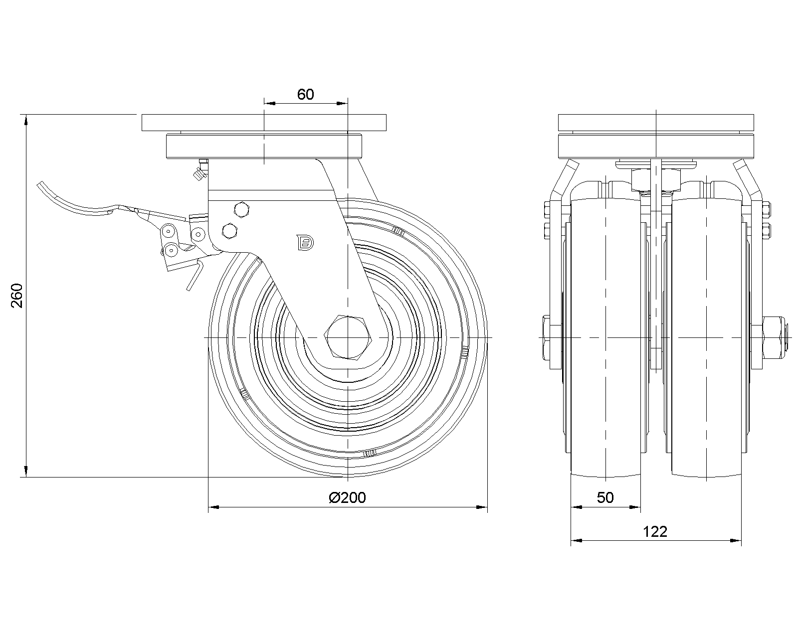 | Bánh xe PU (vòng cung đỏ) Đường kính bánh xe × Chiều rộng bánh xe 200 x 50mm |