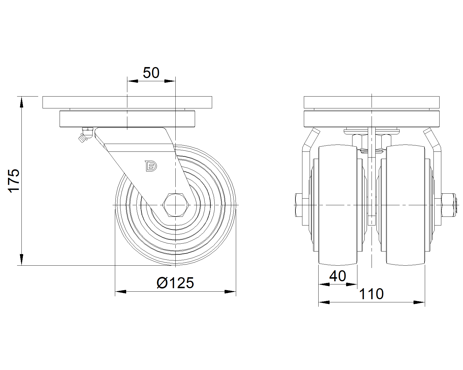 | Bánh xe PU (vòng cung đỏ) Đường kính bánh xe × Chiều rộng bánh xe 125 × 40mm |