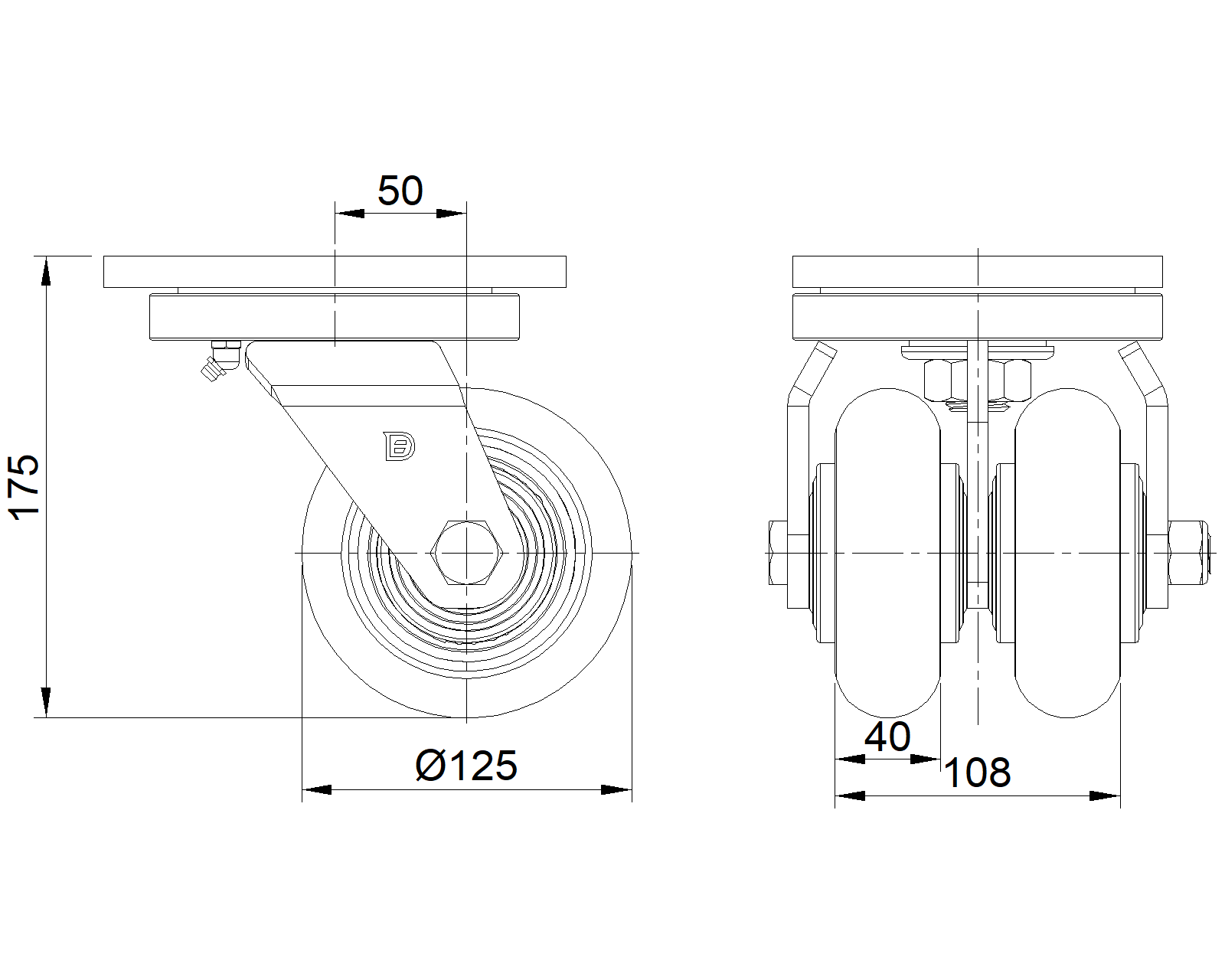| Bánh xe EQPU (hồ quang nâu) Đường kính bánh xe × Chiều rộng bánh xe 125 x 40mm |
