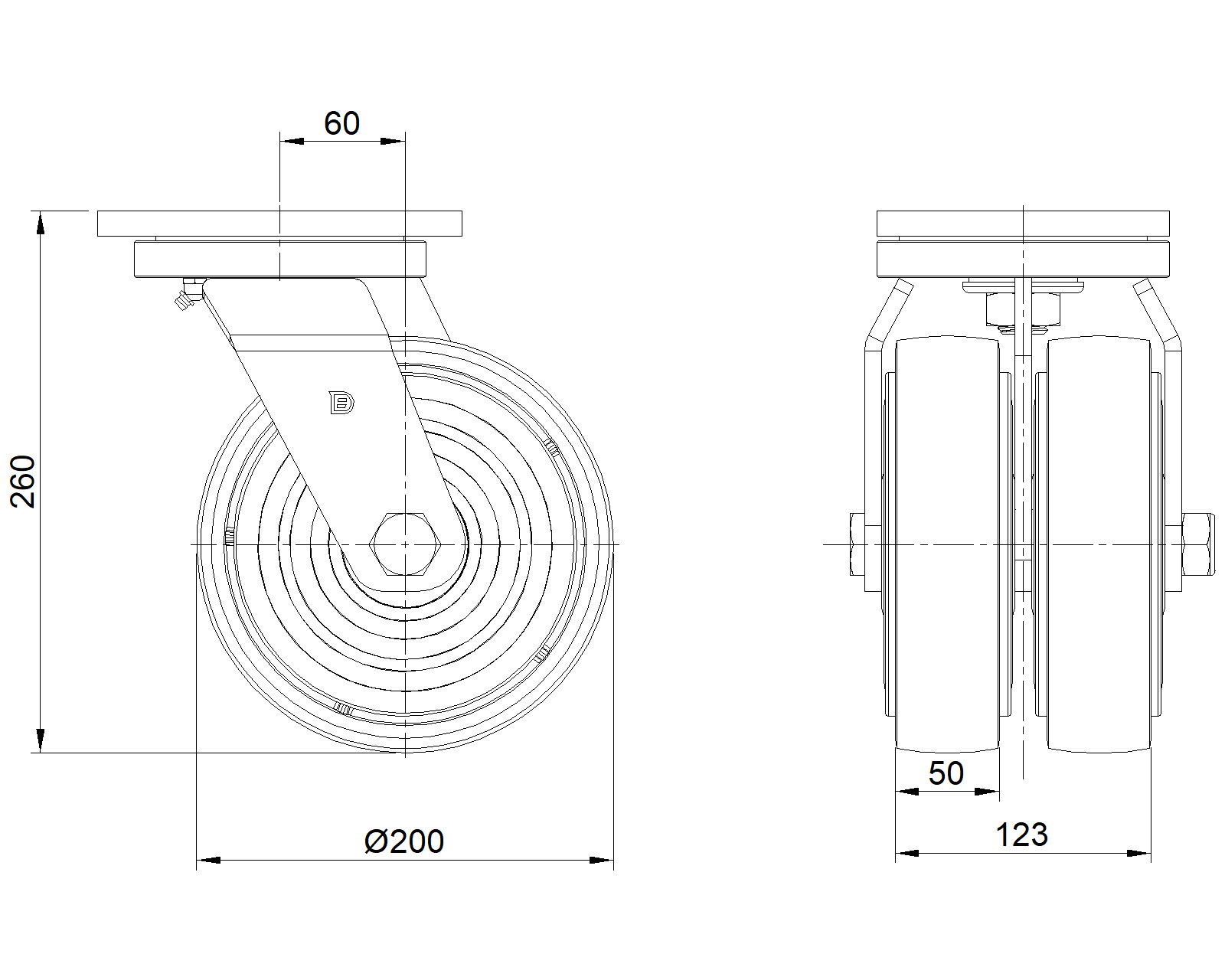 | Bánh xe PU (vòng cung đỏ) Đường kính bánh xe × Chiều rộng bánh xe 200 x 50mm |
