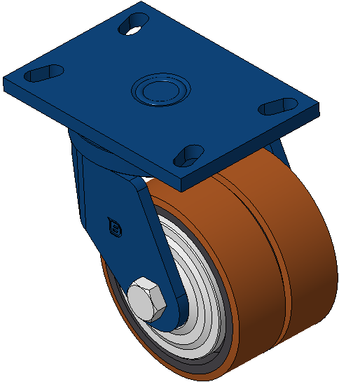 | Bánh xe xoay với khung thép hàn và lớp sơn phủ màu xanh.