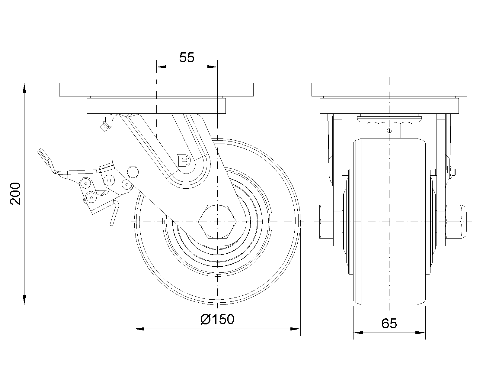 | Bánh xe phanh sau, khung thép hàn, sơn xanh Lắp đế, khoảng cách lỗ 140x105mm Lõi gang, gai polyurethane chất lượng cao Hoàn thiện màu đỏ tía phay, vòng bi chính xác |