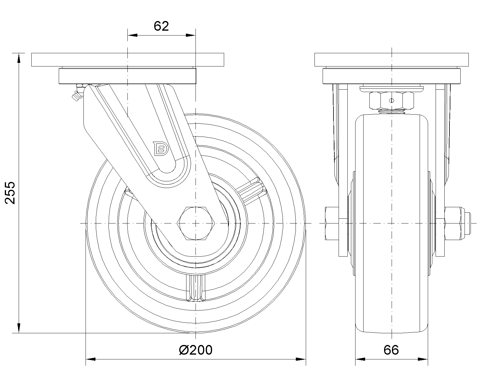 | XPU Đường kính bánh xe × Chiều rộng bánh xe 200 x 66mm |