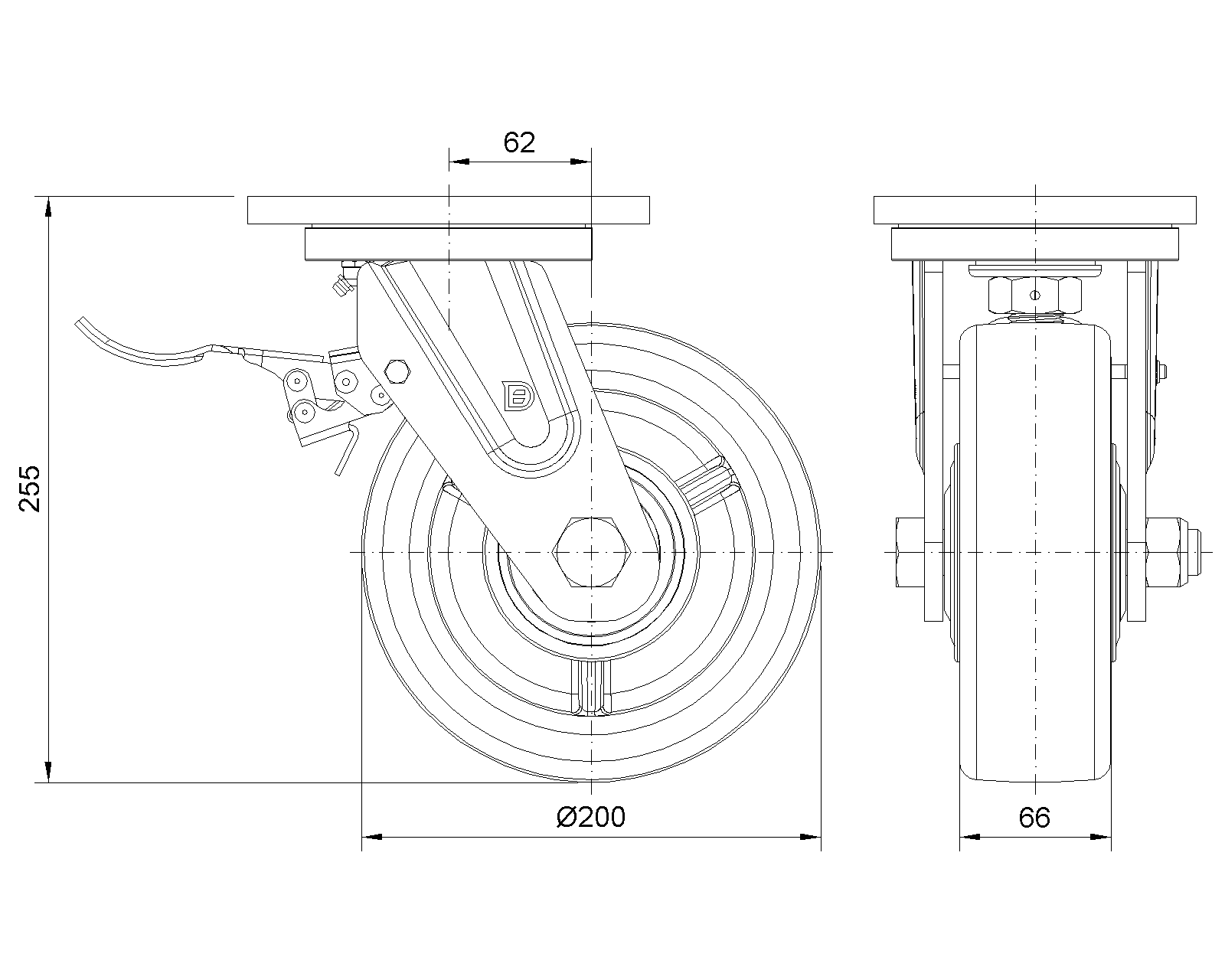 | XPU Đường kính bánh xe × Chiều rộng bánh xe 200 x 66mm |