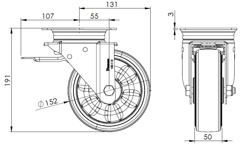 | Đường kính bánh xe hiệu ứng đầy đủ W × chiều rộng bánh xe 152 x 50mm |