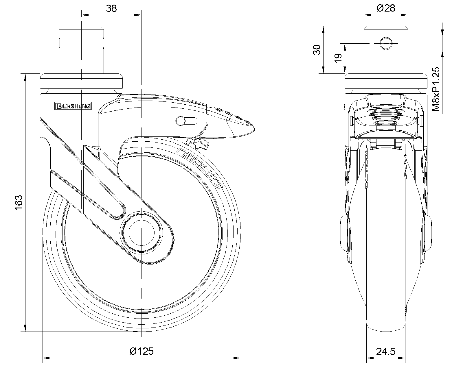双煞式锁定系统的脚轮,插心铆合—Ø28x30L 黑色脚架采用聚醯胺增强料,插杆式安装 防銹,耐腐蚀,美观,经济,转动灵活 耐冲击聚丙烯轮芯,热塑性弹性体(TPR)轮面 黑色,轮子轴承—精密滚珠 |