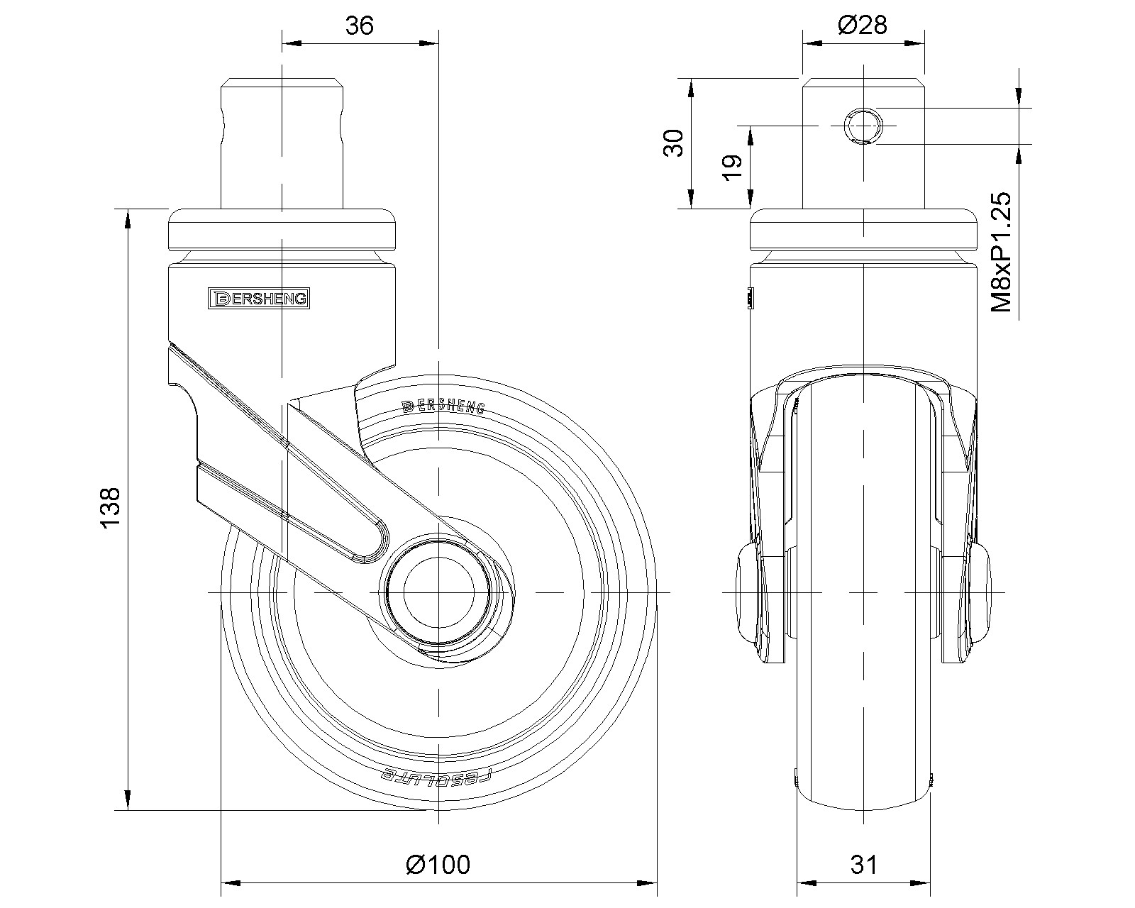 活动式脚轮,插心铆钉—Ø28x30L 黑色脚架采用聚醯胺增强料,插杆式安装 防銹,耐腐蚀,美观,经济,转动灵活 耐冲击聚丙烯轮芯,热塑性弹性体(TPR)轮面 黑色,轮子—中管式 |