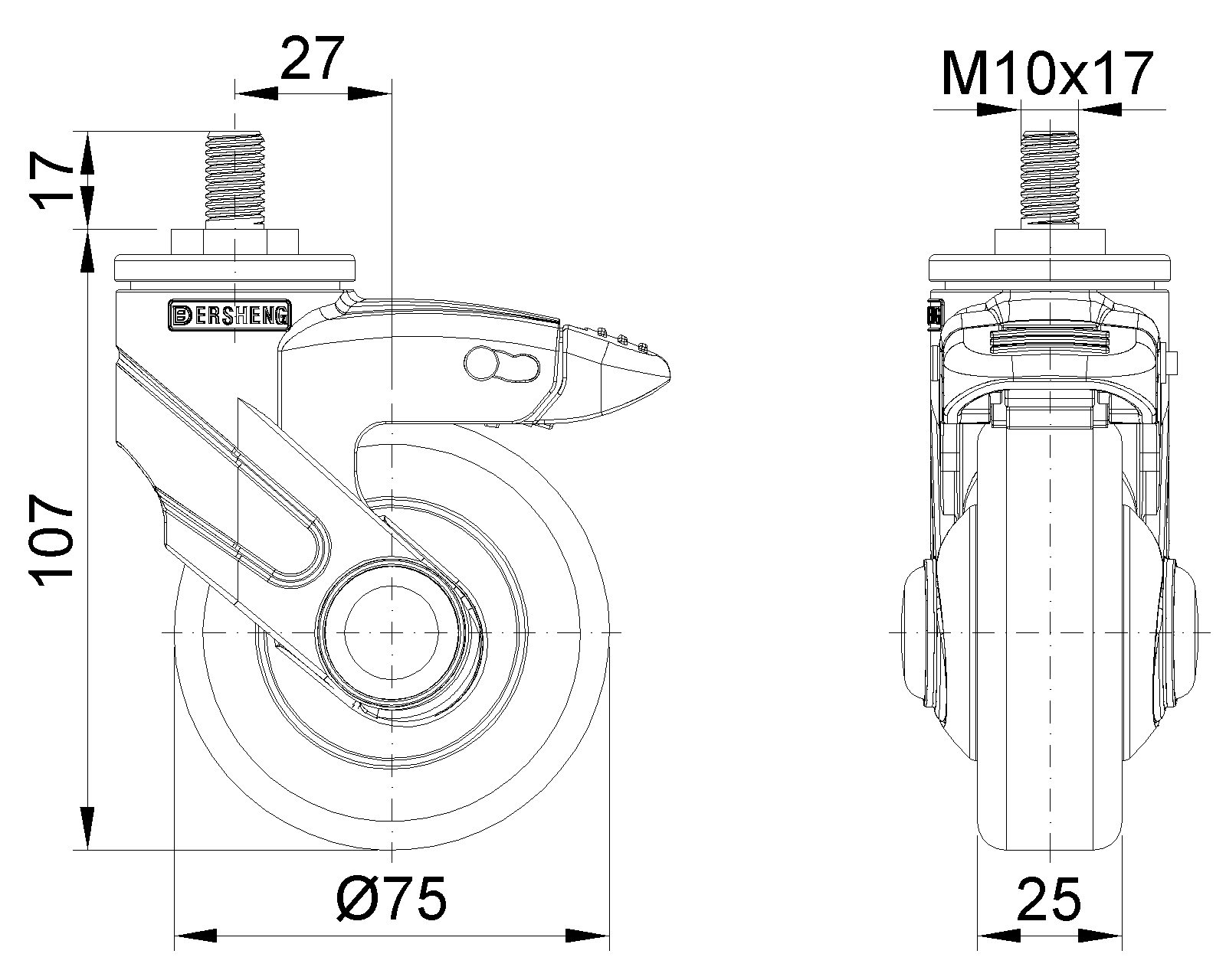 双煞式锁定系统的脚轮,丝扣M10x17 黑色脚架采用聚醯胺增强料,丝扣式安装 防銹,耐腐蚀,美观,经济,转动灵活 耐冲击聚丙烯轮芯,热塑性弹性体(TPR)轮面 黑色,轮子—中管式 |